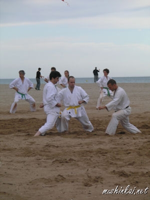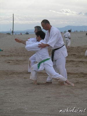 Le cours commence : « alignez-vous. Décalez-vous un sur deux. Encore. Seiza ». Nous descendons en seiza. Que nous réserve Luis ? « mae-giri à partir de seiza ». Quoi ? ! Démonstration de Luis : partant de la position à genoux, le genoux monte à l’épaule puis se tend, balle du pied en avant, puis la jambe retombe en zen-kutsu. La jambe arrière suit et se retrouve à 90°, les doigts de pieds au sol. Vache ! Ce n’est pas gagné ! Luis compte « itch » : la jambe monte bien et ce n’est pas trop vilain, mais la jambe arrière n’a pas bien suivi. « Ni » : au tour de l’autre jambe, pour un résultat équivalent. J’essaye d’améliorer la forme du pied. « San » : encore. « Shi » : et encore. « Go » : et encore. « Roku » : et encore. Une ceinture noire vient me rectifier la jambe arrière, ce n’est pas évident du tout. A chaque coup de pied, le genou de la jambe arrière creuse un sillon dans le sable. A force, les genoux fatiguent. Luis ré-explique et remontre le mouvement, et c’est reparti, chacun à son rythme cette fois. Cet exercice semble durer un temps très long. Finalement, le « nahoré » retentit : retour en seiza, prêt à tout. « Yassumé », on relâche, et nous retournons nous aligner.